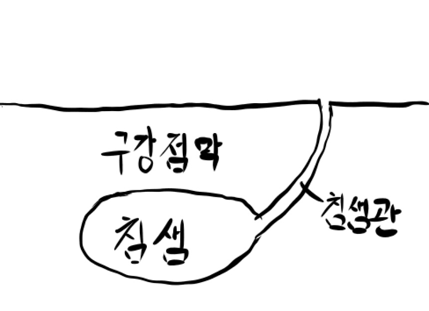 위에서 말한 것처럼 점액낭종은 점액의 배설관의 문제로 생기는데요. 마찬가지로 구강 내에 점액낭종은 침샘관이 막히거나 협착되는 경우 생기게 됩니다.